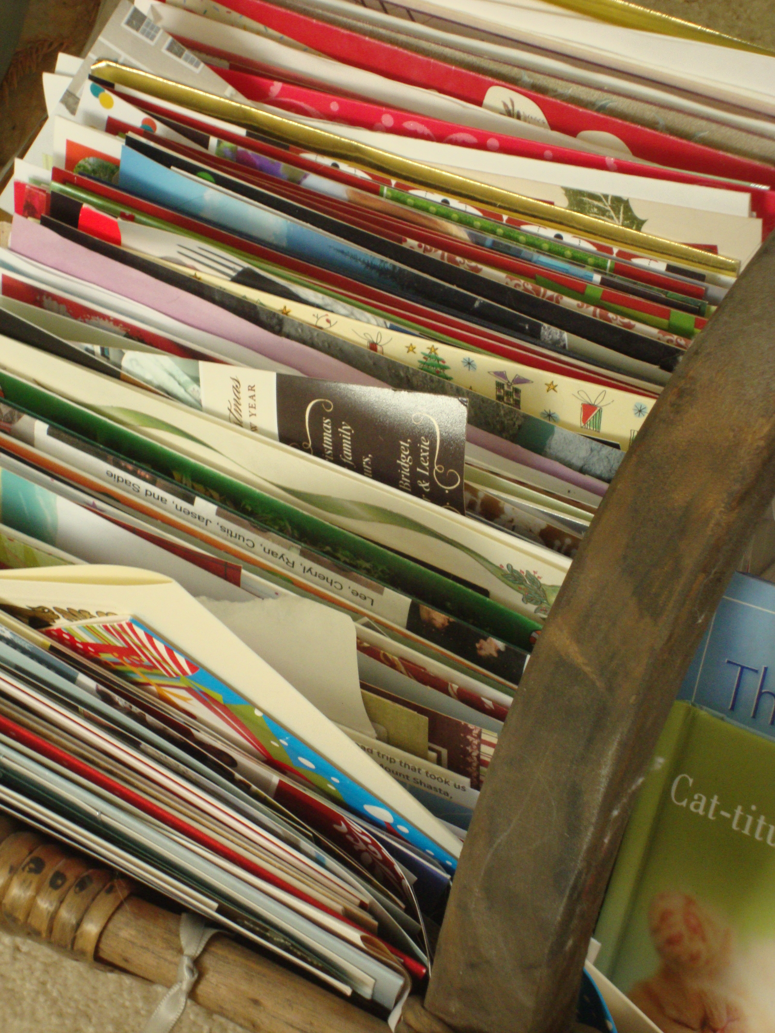 I have a large basket in my living room which I refer to as my “Christmas kids” basket…I save every photo from family and friends, including Christmas photo cards and notes, and have them in the basket…flipping through the basket you can see all the children in my life as they grow from babies to adults. You can read family newsletters about their joys and sorrows from that particular year. The basket is quite full now. It is fun to drag out at dinner parties.