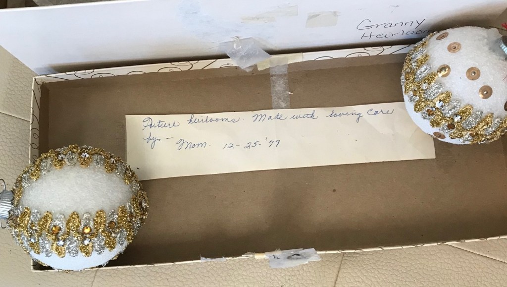 And what about all the memorabilia left by my parents? Military flags and collectibles from my father’s time in the service. Crochet and hand-sewn baby blankets, and home-made crafts from my mom. All the Christmas ornaments she created. She always referred to all of her home-made wares as “future heirlooms.” And they really were… and continue to be cherished and reflected on throughout the years.